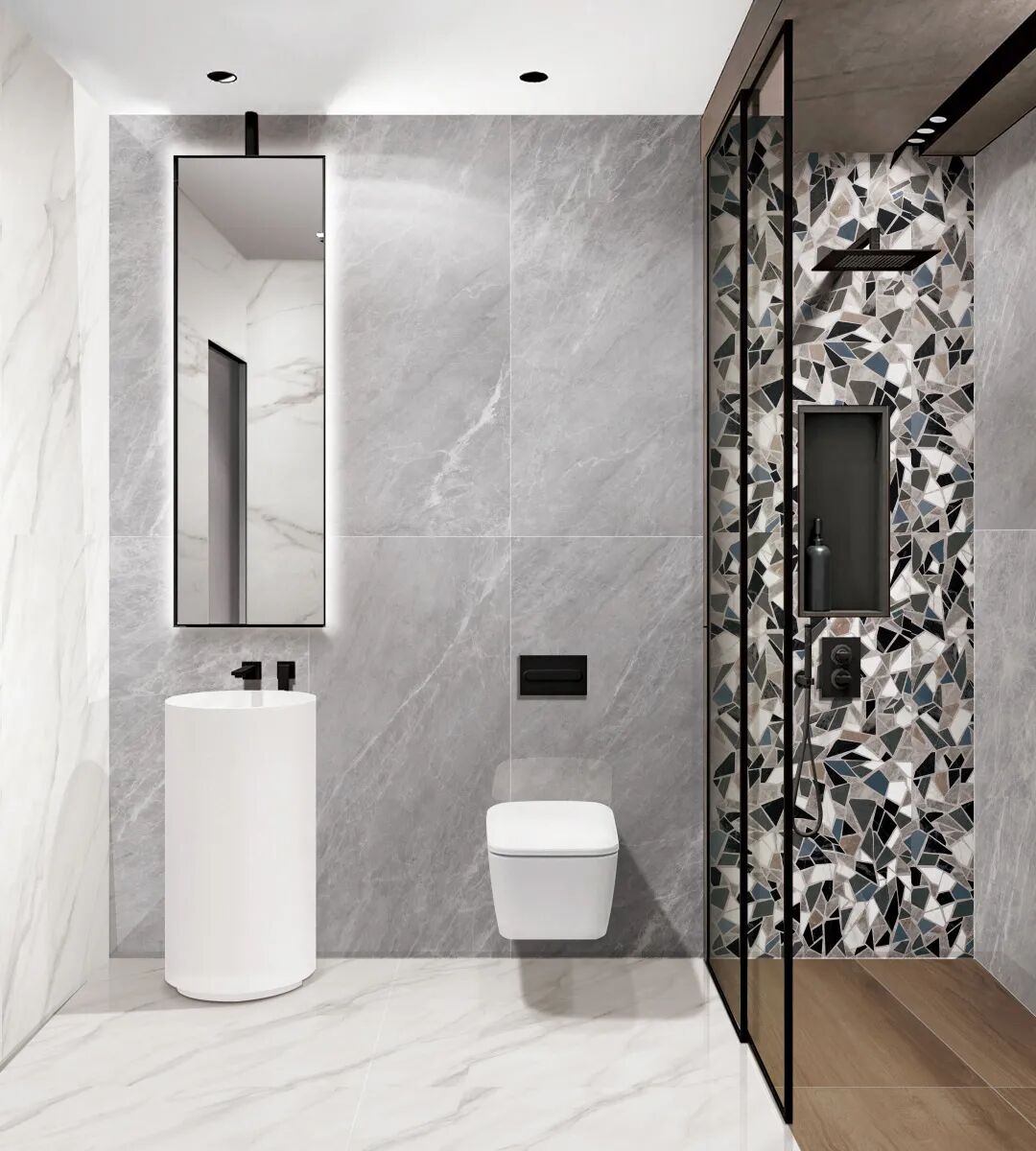 “卡里姆灰”卫生间,弥漫着时尚气息,碎片花砖划分功能区,以一股沉稳安静的力量,让人感受到家的治愈与放松。The "Karim Grey" bathroom is full of fashion, and the fragments and tiles divide the functional areas, with a calm and quiet power, people feel the healing and relaxation of home.