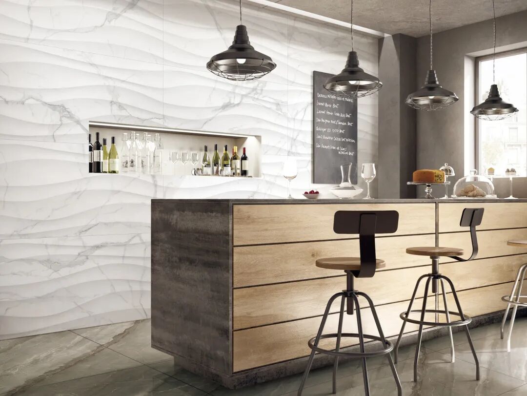 The mold surface is "Statuario" with a strong three-dimensional effect; it makes the kitchen as a whole comfortable and bright. The combination of modern lighting and Western-style tableware makes the space full of elegant beauty.