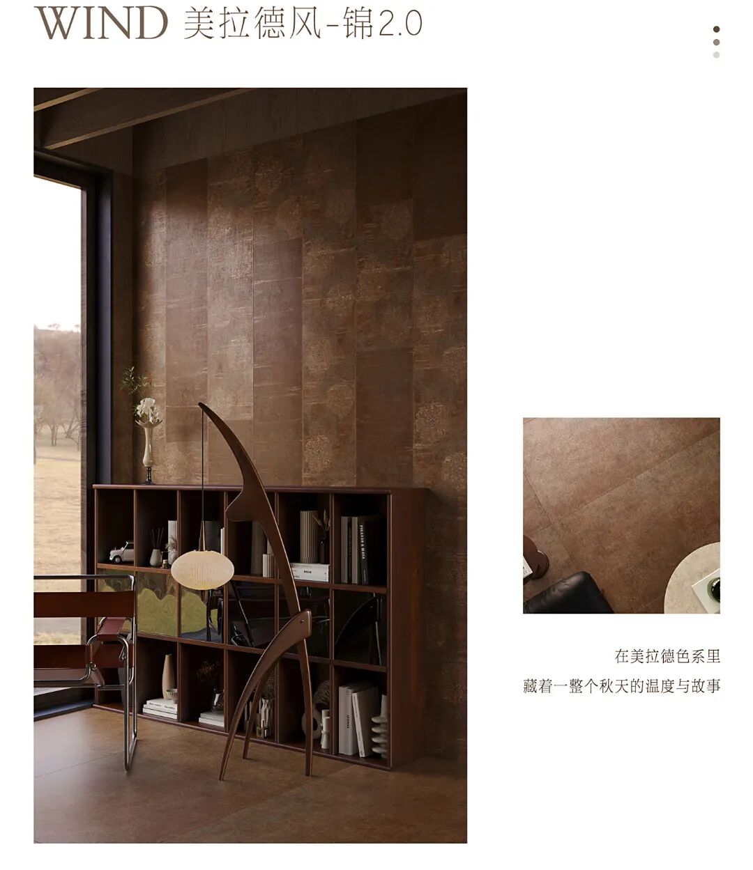 在美拉德色系里,藏着一整个秋天的温度与故事。 美拉德风,是一种极具氛围感与高级感的空间设计风格,它源于美拉德色系,营造出温暖醇厚、复古时尚的感觉。 锦2.0,每一寸都透着美拉德风的韵味。它以非遗香云纱作为创作灵感,融合创新黄金干粒技术,砖面呈现独特的琥珀色金属质感,与美拉德风十分般配。 当自然光照射下来,细腻的质感,独一无二的纹理,自带一种自然的质朴和复古的气息,能让空间散发出时光沉淀的文化底蕴。 锦2.0将独特与百搭这两个看似矛盾的特质完美融合,形成了独树一帜又极具包容性的空间魅力。上墙铺贴时,它营造了温馨柔和的背景;下地铺贴,它又能增加空间的质感和底蕴。 锦2.0运用在美拉德风的空间中,让人感受到宁静与平和,具有很强的治愈效果。所谓高级,不过是让空间有了触摸得到的温度。