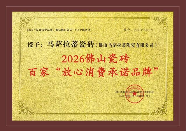 3月31日,在佛山市陶瓷行业放心消费工作委员会主办的“提升消费品质,诚信佛山瓷砖”315专题活动中,结合全国各地业主的真实反馈,经过活动主办方的多轮严格评选,佛山马萨拉蒂瓷砖获得了2026年佛山陶瓷百家“放心消费承诺品牌”的荣誉。