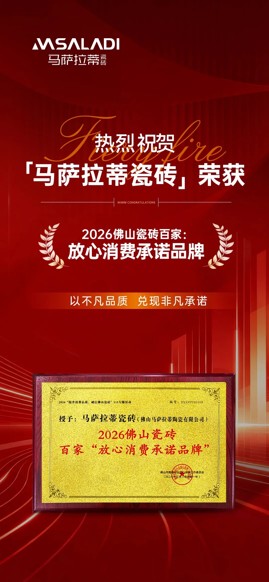 权威认证,荣耀续章 | 马萨拉蒂瓷砖蝉联2026佛山瓷砖百家“放心消费承诺品牌”